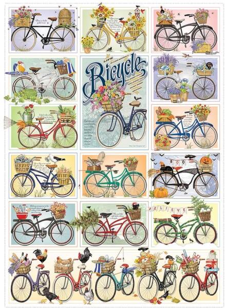 A kanadai Cobble Hill a nosztalgikus, színes, és mindemellett kiváló minőségű kirakókkal kívánja örvendetessé tenni a játék élményt kicsiknek és nagyoknak egyaránt. A Cobble Hill 1000 db-os puzzle - Bicycles című képen bicikli montázs látható, kirakást követően.