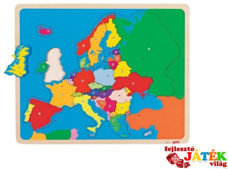 A GOKI Európa kirakóját minden gyerek és minden szülő szeretni fogja. A gyerekek a vidám és izgalmas formák miatt, a szülő azért, mert már korán sikerül megismertetnie a gyermekét Európával. A játék kiválóan fejleszti a memóriát földrajzi ismereteket beszédkészséget formafelismerést A játék tartalma: 35 kirakós elem A játék anyaga: fa A teljes kép mérete: 32 x 3