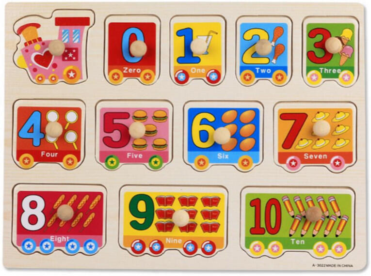 RAKTÁRRÓL AZONNAL! Fogantyús készségfejlesztő fa puzzle - Ismerkedj a számokkal 0-10-ig Egy fogantyús puzzle, mely megismerteti a gyermekekkel a számokat, műveleti jeleket és formákat. A fogantyú segítségével könnyen a megfelelő helyre helyezhetőek vissza. A táblán angol nyelven találhatók a megnevezések. A játék során gyermekünk megismerkedik a színekkel, formákkal