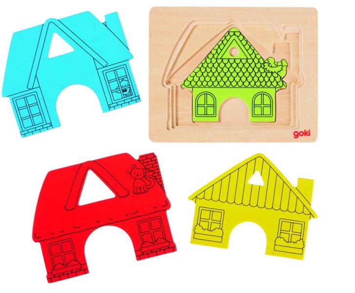 Többrétegű fa kirakó játék, 4 db-os. A fa kirakó játék 4 kisebb-nagyobb házikót tartalmaz, melyet helyes sorrendben kell a keretbe egymás alá-fölé helyezni. A kisebb-nagyobb fogalom megtanulása mellett alkalmas a színek rögzülésére is. Az apró kezek koordinációja is fejlődik a fa kirakó játék elemek keretbe illesztése során. Anyaga: fa Méret: 17,5 x 14 cm