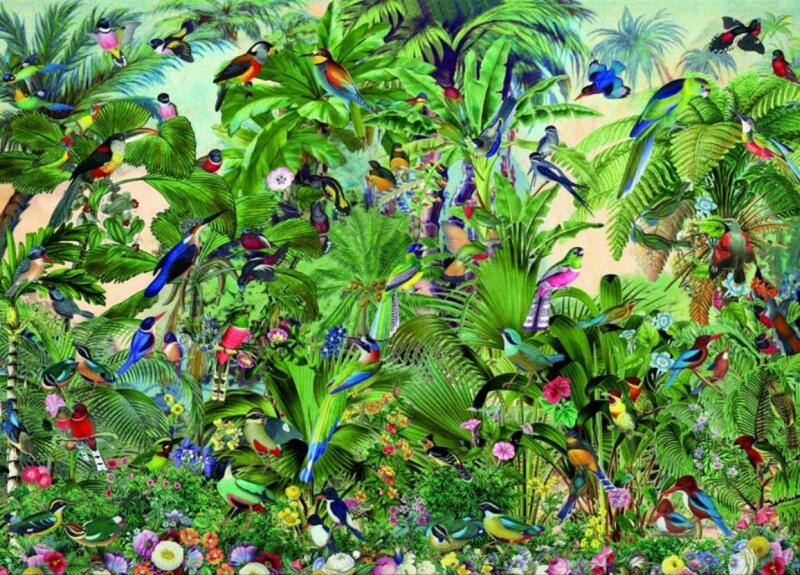 A francia Bluebird vállalat 2019-ben lépett piacra kiváló minőségű kirakóival, megfizethető áron. Fontos szempont számukra a környezettudatosság is, ezért kirakóik dobozait úgy tervezték, hogy minimális mennyiségű kartont használjanak fel a gyártás során. Az 1500 db-os Bluebird puzzle - Birds című képén a trópusi esőerdő k színpompás és változatos madárvilága j