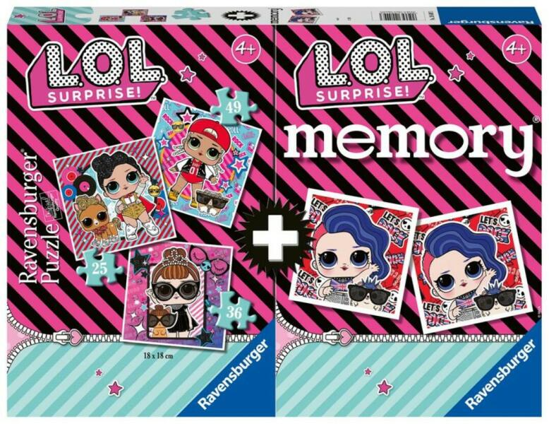 Ravensburger 3 az 1-ben puzzle és memóriajáték - LOL (20549) A doboz tartalma: 3 db puzzle (25, 36 és 49 db-os) és egy memóriajáték - 24 pár kártyával -, a meseszép LOL b abák képeivel illusztrálva. A kirakott képek mérete: 18 x 18 cm. Ezek a játékok fejlesztik a memóriát, a megfigyelő képességet és a koncentrációt, megszínesítik a játékidőt!