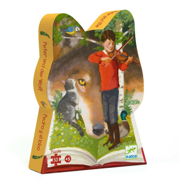 Péter és a farkas, formadobozos puzzle. Péter és a farkas, formadobozos puzzle. A gyermek egy nagy képet rak ki a puzzle-ből és illusztrálva látja Péter és a farkas híres meséjét. Ezt a gyönyörű, 50 darabos kirakós játékot vonzó sziluettű dobozban mutatjuk be. Tartalma: 50 darabos karton puzzle (62 x 20 cm) A doboz méretei: 27 x 21 x 6 cm Péter és a farkas Prokofjev gyerme