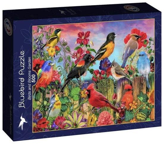 A francia Bluebird 2019 óta van jelen a kirakók világpiacán. Magas minőségű, környezettudatos technológiával készült, mégis megfizethető áron elérhető puzzle képei közt elsősorban művészi alkotások találhatók. Az 500 db-os Bluebird puzzle - Birds and Blooms Garden című képén színes virágok és kerti madarak láthatóak.