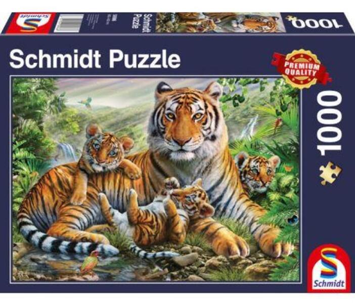 A Schmidt puzzle kiváló minőségű, német gyártmányú kirakó. A speciális matt lakk felhasználás következtében a kirakók fényvisszaverődés nélkül tárják elénk a szebbnél szebb képeket. Schmidt 1000 db-os puzzle - Tiger and Cubs a kirakott képen egy csodálatos tigris családot láthatunk.