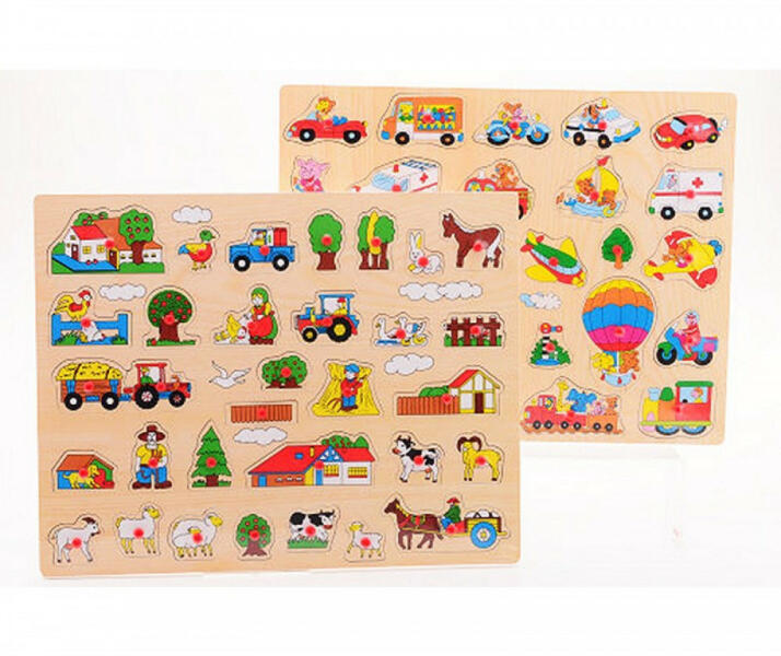 Választható témák: jármű / farm Minőségi fa alapanyagból készült. Minden képet egy praktikus fogantyúval lehet kivenni, illetve visszahelyezni, ami a kis kezek motorikus fejlődése érdekében nagyon hasznos. Fejlődik a gyermek forma- és képfelismerése is. Mérete: 35 x 45 x 3 cm Dinotoys