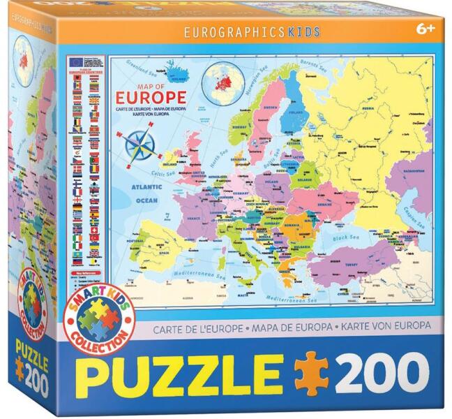 Az új technológiának köszönhetően a puzzle Smart cut vágással készült, ami izgalmasabb kirakást nyújt. Az EuroGraphics 200 db-os puzzle - Map of Europe kirakó képén egy világtérkép látható.