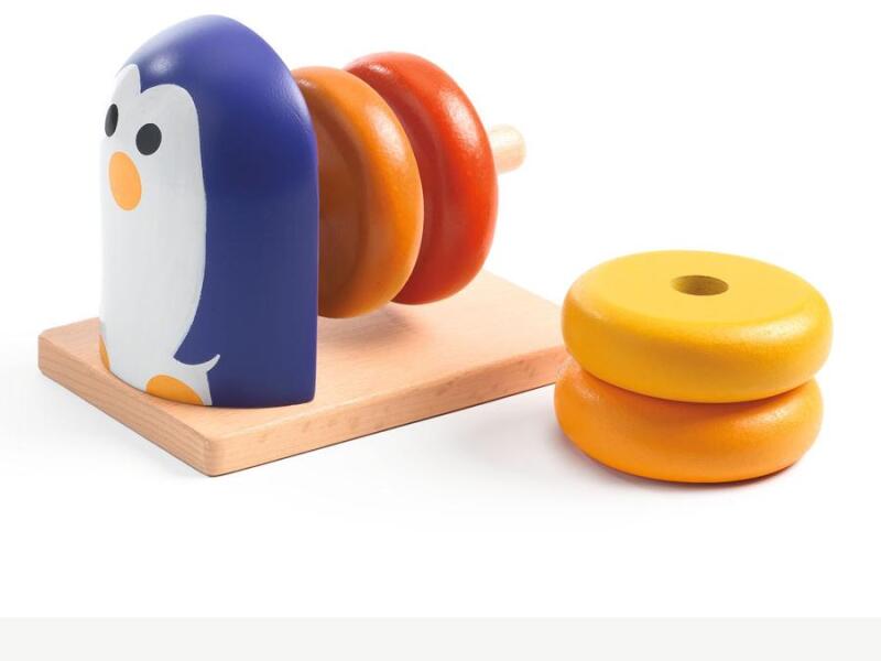 Pingvines fakarika összerakó. Ennek a kedves pingvinnek a hátán egy vízszintes rúd található, amelyre a gyermek színes fakorongokat rakhat sorba. Tartalma: 1 db talp vízszintes rúddal 4 db színes fakorong Méretei: 11,5 x 9 x 7,5 cm Gyermekversek