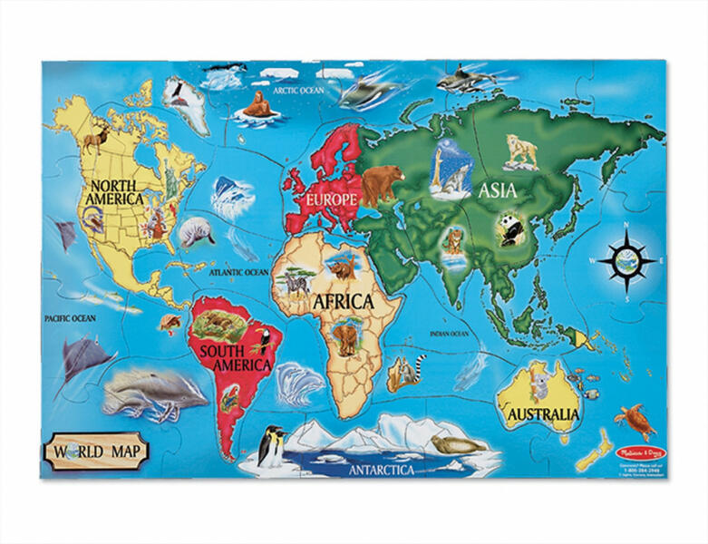 Fedezd fel és ismerd meg a Föld kontinenseit és annak néhány állati lakóját ezzel a 33 darabos kirakóssal. A puzzle játék darabjai szép nagyok, így gyermeked is könnyedén illesztheti egyiket a másikhoz. A puzzle darabok felülete olyan, amit könnyen tudsz tisztítani, így mindig olyan lehet, mintha vadonatúj lenne a térképes kirakó. Gyermeked szórakozva, játék közben tanu