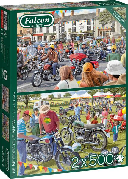 2x500 darabos kirakó A doboz 2db egyenként 500 darabos kirakót tartalmaz! Márka: Falcon Művész: Victor McLindon Kirakott kép méret: egyenként 49 x 35 cm Doboz méret: 36,5 x 27 x 6,6 cm Eredeti cím: The Motorcycle Show GTIN: 8710126113127
