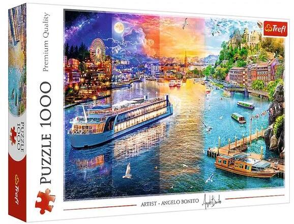 A Trefl kirakók kiváló minőségű, speciális fényvisszaverő papír felhasználásával, ökológiai anyagból készülnek, amely megkönnyíti az összeillesztést. A Trefl 1000 db-os puzzle - River cruise - Angelo Bonito (10860) egy elegáns és festői kirakós, amely Angelo Bonito művész alkotását ábrázolja. Ez a puzzle 1000 darabból áll, egy nyugodt, folyami környezetet mutat b