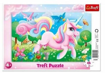 Ezzel a nagyszerű 15 darabos kirakós játékkal egy olyan képet alkothatsz, melyen egy unikornis boldogon ugrándozik a virágos réten. A kirakóst egy keretben kell összeállítanod, ami a segítségedre lesz. A Trefl puzzle darabok tökéletesen illeszkednek és a kompromisszummentes, professzionális nyomdai eljárásoknak köszönhetően az elkészült kép lélegzetelállítóan éles é