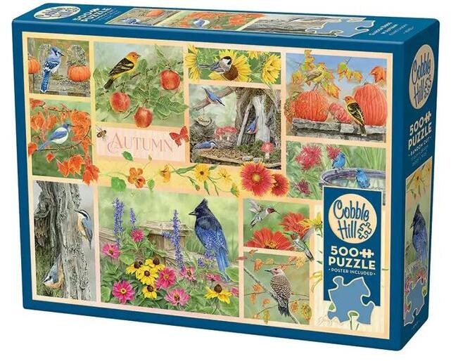 A kanadai Cobble Hil l a nosztalgikus, színes, és mindemellett kiváló minőségű kirakókkal kívánja örvendetessé tenni a játék élményt kicsiknek és nagyoknak egyaránt. A Cobble Hill 500 db-os puzzle - Garden Birds in Autumn (45103) egy lenyűgöző és élénk színvilágú kirakó, amely az őszi kertben megjelenő madarak szépségét ünnepli