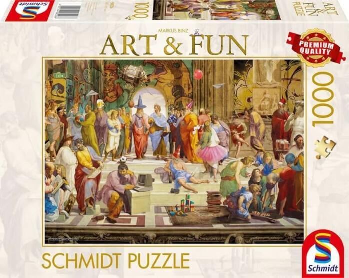 A Schmidt puzzle kiváló minőségű, német gyártmányú kirakó. A speciális matt lakk felhasználás következtében a kirakók fényvisszaverődés nélkül tárják elénk a szebbnél szebb képeket. A Schmidt 1000 db-os puzzle - School of Athens 2024 (58526) kirakott képén a híres School of Athens festmény újragondolt változata látható, modern és friss megközelítésben.