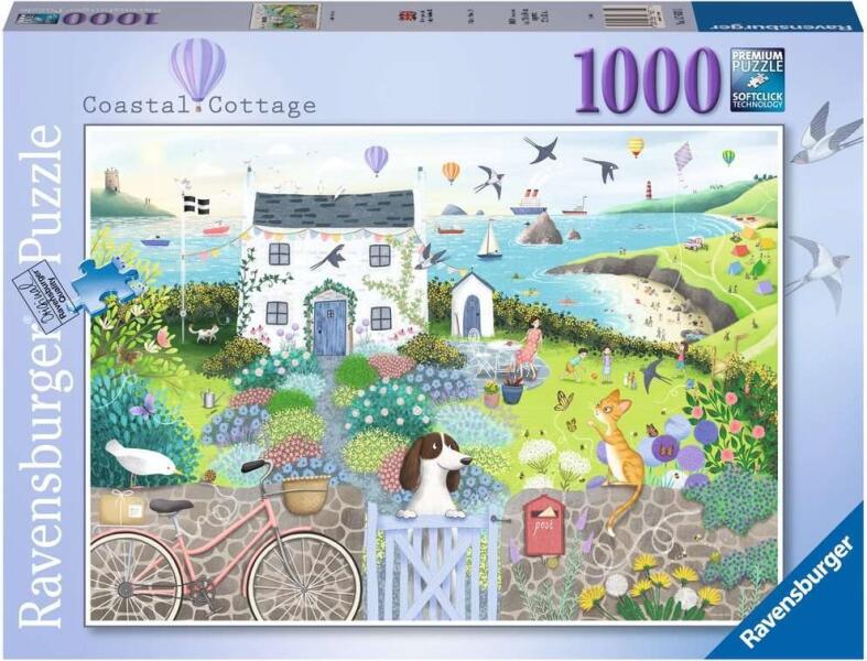 1000 darabos kirakó Gyárilag védőfólia nélkül készült! Márka: Ravensburger Művész: Emma Allen Kirakott kép méret: 70 x 50 cm Doboz méret: 33,5 x 25,5 x 5,5 cm Eredeti cím: Coastal Cottage GTIN: 4005555011040