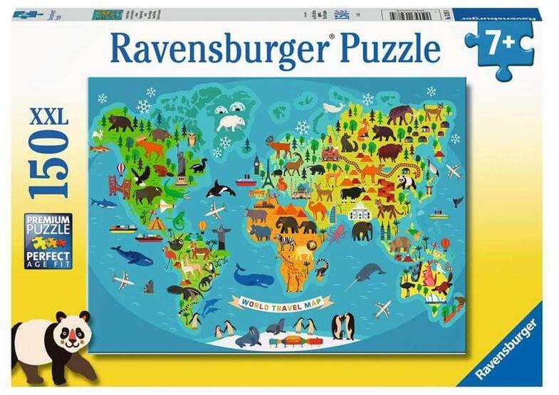 A Ravensburger a világ legnagyobb puzzle gyártója. Széles választékban kapható kirakói a minőséget és a sokszínűséget képviselik. A Ravensburger 150 db-os - Állatos világtérkép a kontinenseket és néhány ismert épületet mutat be, mint a Big Ben, az Eiffel-torony vagy éppen a Taj Mahal . A térkép különböző vadon élő állatfajokat is ábrázol, így rengeteg felfedezn