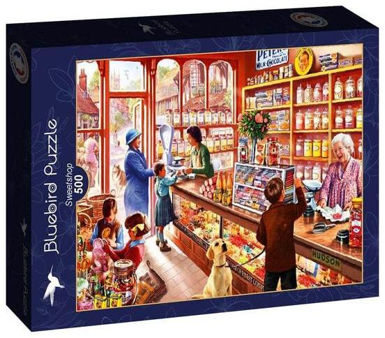A francia Bluebird 2019 óta van jelen a kirakók világpiacán. Magas minőségű, környezettudatos technológiával készült, mégis megfizethető áron elérhető puzzle képei közt elsősorban művészi alkotások találhatók. Az 500 db-os Bluebird puzzle - Sweetshop című képén egy nosztalgikus hangulatú édességbolt látható. Van itt mindenféle nyalánkság, csokik, cukorkák és