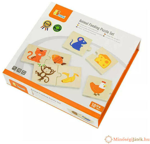 Játszva, fejtörőn keresztül a legjobb megtanulni, melyik állatnak mi a neve és mit eszik. Cuki rajzok, könnyű kirakósok, sok sikerélmény és tanulás egyben. Fából készült készségfejlesztő játék. A doboz 24 darab kirakóból áll, melyeken állatok és eledelük találhatóak. A játék célja, hogy a kisgyermekek megtalálják és összeillesszék az adott állathoz tartozó e