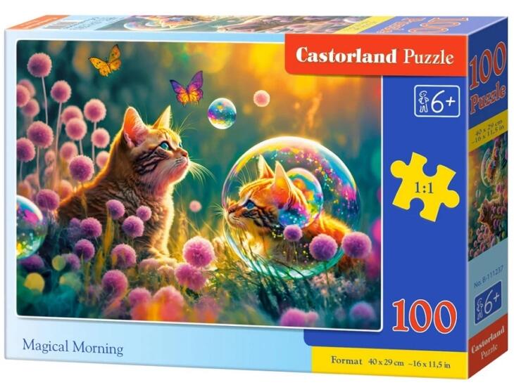 A Castorland kirakók sokszínűségükről ismertek és igen széles választékban kaphatóak. Hagyományos képi témáik mellett különlegesebb, városokat és nevezetességeket ábrázoló kirakókat is találunk kínálatukban. A Castorland 100 db-os puzzle - Varázslatos reggel képén két cicát láthatunk egy varázslatos réten.