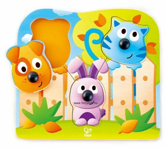 A kutyus, a nyuszi és a cica várja, hogy megtaláld helyüket a képen. Fogantyús puzzle a legkisebbeknek, mely kedves színeivel és formáival biztosan örömet szerez majd. Kiváló minőségű, időtálló forma berakó, a Hape kínálatából. A fogantyúk mérete (kb. 2 cm) kicsit nagyobb az átlagosnál, hogy a picik is könnyen meg tudják fogni.