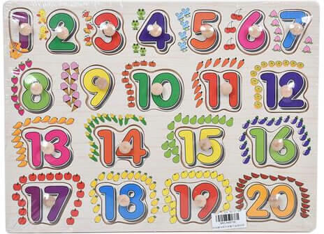 Ismerkedj a számokkal játék közben. Fa számok számolni tanító fatáblán. A fából készült formaválogatós puzzle-n színes számok találhatóak. A számok mellett különböző gyümölcsök vagy zöldségek láthatóak a számnak megfelelő mennyiségben. A számokat a rajtuk lévő fogó segítségével könnyedén ki lehet emelni és helyére tenni az egyes számokat. Számok 1-20