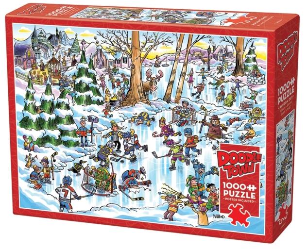 A kanadai Cobble Hill a nosztalgikus, színes, és mindemellett kiváló minőségű kirakókkal kívánja örvendetessé tenni a játék élményt kicsiknek és nagyoknak egyaránt. A Cobble Hill 1000 db-os puzzle - DoodleTown: Hockey Town című képen korcsolyázó gyerekeket láthatunk kint a szabadban.