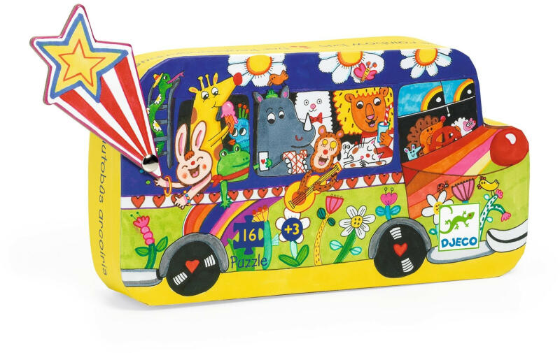 Formadobozos puzzle: Szivárványbusz Formadobozos puzzle: Szivárványbusz. Ez a színes, 16 darabból álló kirakós játék egy aranyos virágos busz alakú sziluettdobozban érkezik. Tartalma: 16 darabos keménykarton puzzle (25 x 25 cm) A csomagolás méretei: 24 x 12 x 6 cm Tartalma: 16 darabos karton puzzle (25 x 25 cm).