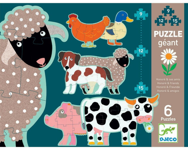 6 háziállat kirakása 3 nehézségi szinten. Óriás puzzle a Djeco grafikus művészének tervezésében. Hat különböző, ám mégis egymásra épülő, egész óriás puzzle. A három rész külünböző nehézségi fokozatnak felel meg az összerakás, kirakás szempontjából. Különböző háziállatok képei kerülnek egymás fölé, vagy mellé. Csodás képet adnak ki együtt, egyik
