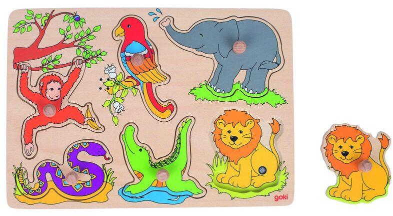 Fogantyús fa kirakó játék 6 kirakó elemmel. A kirakó darabokat a helyükre téve az adott vadállat hangja szólal meg. Anyaga: fa Méret: 30 x 21 cm