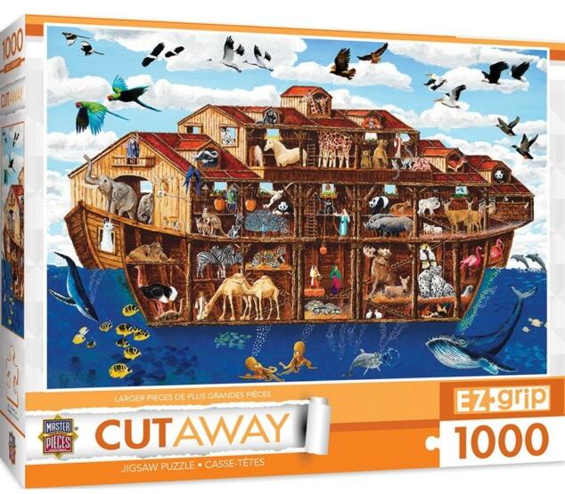 Az amerikai MasterPieces Puzzle Company gyönyörű és részletgazdag kirakókat gyárt különféle stílusokban és darabszámokban. A cég több világhírű márkával együttműködve az innováció és magas minőség mellett nagy gondot fordít az újrahasznosításra is. A MasterPieces 1000 db-os puzzle - Noah's Ark című képen a Noé bárkájában lapuló állatok láthatók.