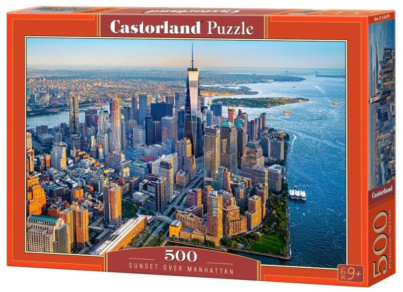 A Castorland kirakók sokszínűségükről ismertek és igen széles választékban kaphatóak. Hagyományos képi témáik mellett különlegesebb, városokat és nevezetességeket ábrázoló kirakókat is találunk kínálatukban. A Castorland 500 db-os puzzle - Naplemente Manhattan felett című képen New York híres kerülete látható.