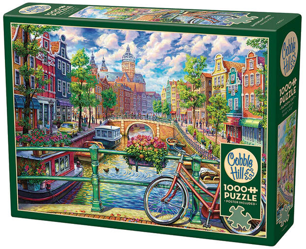 A kanadai Cobble Hill a nosztalgikus, színes, és mindemellett kiváló minőségű kirakókkal kívánja örvendetessé tenni a játék élményt kicsiknek és nagyoknak egyaránt. A Cobble Hill 1000 db-os puzzle - Amsterdam Canal című képen Amsterdam híres csatornája láthaó a hídról megpillantva.