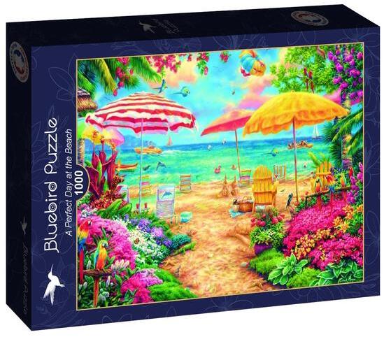 A francia Bluebird vállalat 2019-ben lépett piacra kiváló minőségű kirakóival, megfizethető áron. Fontos szempont számukra a környezettudatosság is, ezért kirakóik dobozait úgy tervezték, hogy minimális mennyiségű kartont használjanak fel a gyártás során. A Bluebird 1000 db-os puzzle - A Perfect Day at the Beach című képén egy idilli tengerparti strand elevenedik meg, C