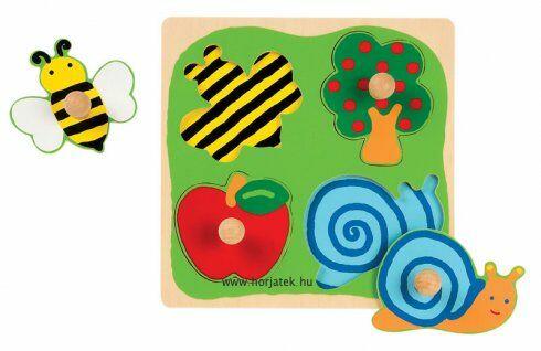 Ezek a fából készült fogantyús puzzle-k a legkisebbek kézügyességét, szín- és forma felismerését fejlesztik. Játék közben megtanulják az állatok nevét, ismereteket gyűjtenek környezetükről. Keresd meg a táblán a helyét a méhecskének, almafának, almának és a csiga-bigának. A mintázat segít a kirakásban. A nagy méretű fogantyúk a legkisebb kezekhez készültek,