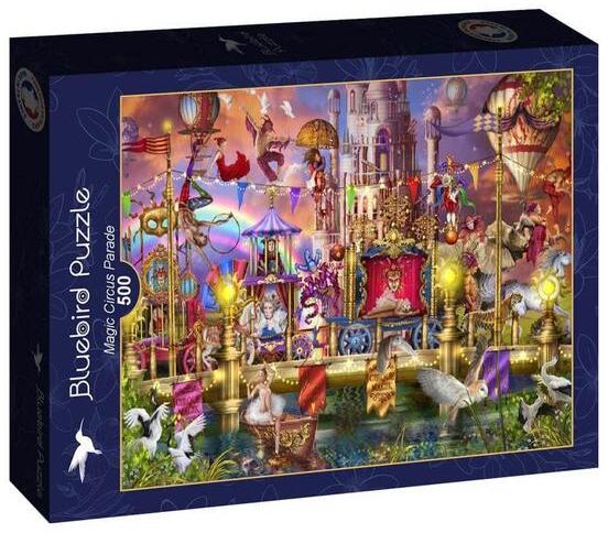 A francia Bluebird 2019 óta van jelen a kirakók világpiacán. Magas minőségű, környezettudatos technológiával készült, mégis megfizethető áron elérhető puzzle képei közt elsősorban művészi alkotások találhatók. Az 500 db-os Bluebird puzzle - Magic Circus Parade képén magával ragad a varázslatos cirkuszi forgatag! Tigris, elefánt, egy pompás paripa, bohócok, artisták