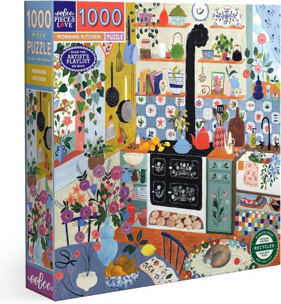 1000 darabos kirakó Új, kisebb dobozban! Külső védőfólia nélküli kiadás. Márka: Eeboo Művész: Flora Waycott Kirakott kép méret: 58,4 x 58,4 cm Doboz méret: 25,5 x 25,5 x 5 cm Eredeti cím: Morning Kitchen GTIN: 689196521317