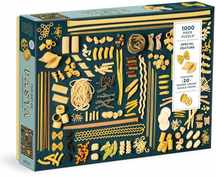 1000 darabos kirakó Különleges, rejtett formákat tartalmazó kirakó!Gyárilag fólia és leragasztás nélkül készült. Márka: Galison Művész: Lucy Schaeffer Kirakott kép méret: 68.58 x 50.8 cm Doboz méret: 29 x 20,5 x 5 cm Eredeti cím: The Art of Pasta GTIN: 9780735376953