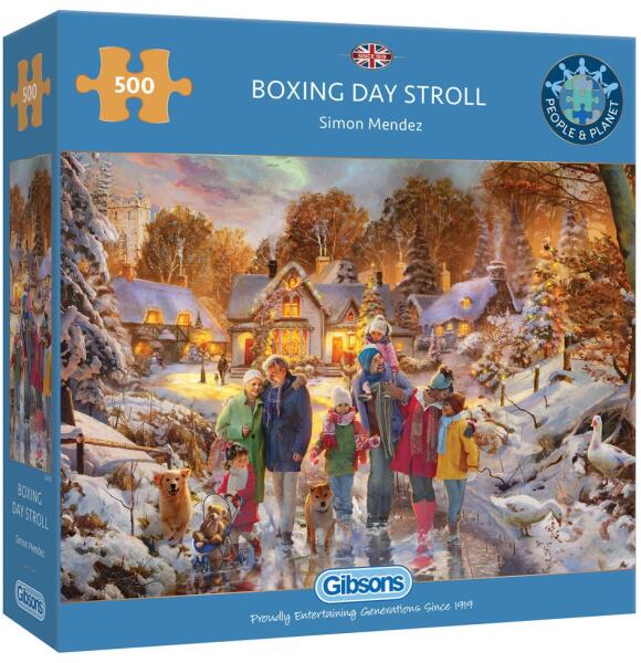 500 darabos kirakó . Márka: Gibsons Művész: Simon Mendez Kirakott kép méret: 48 x 34cm Doboz méret: 21 x 21 x5 cm Eredeti cím: Boxing Day Stroll GTIN: 5012269036107