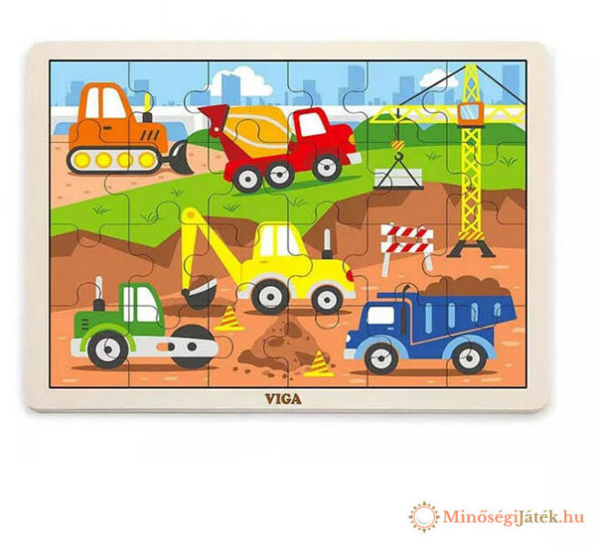 Fa kirakós kerettel, a gyerekek körében legnépszerűbb munkagépekkel. Kedves rajzok és vidám színek. A puzzle, élménye mellett hozzájárul a gyermekek szín- és formafelismerő, valamint kombinációs készségének fejlesztéséhez. Kirakáshoz célszerű előbb a kép keretét kirakni, és így haladni egyre beljebb. Fantasztikus élmény, ahogy a kis kockák egy gyönyörű képpé