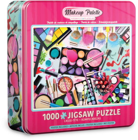 Az Eurographics 1000 db-os puzzle fém dobozban - Makeup Palette című képen különböző, színes és vidám, sminkeléshez szükséges eszköz található. Az 1000 db-os puzzle fém dobozban tárolható, a doboz poszter képet tartalmaz. Az Eurographics gyártó nagy figyelmet fordít a környezettudatos működésre, úgy a termékeik előállításánál, mint a dolgozóik környezetbarát