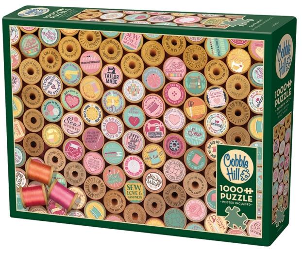 A kanadai Cobble Hill a nosztalgikus, színes, és mindemellett kiváló minőségű kirakókkal kívánja örvendetessé tenni a játék élményt kicsiknek és nagyoknak egyaránt. A Cobble Hill 1000 db-os puzzle - Sew Happy! egy olyan képet ábrázol, amely a varrás és kézimunka témájára fókuszál. A fa orsókon különböző idézetek szerepelnek.
