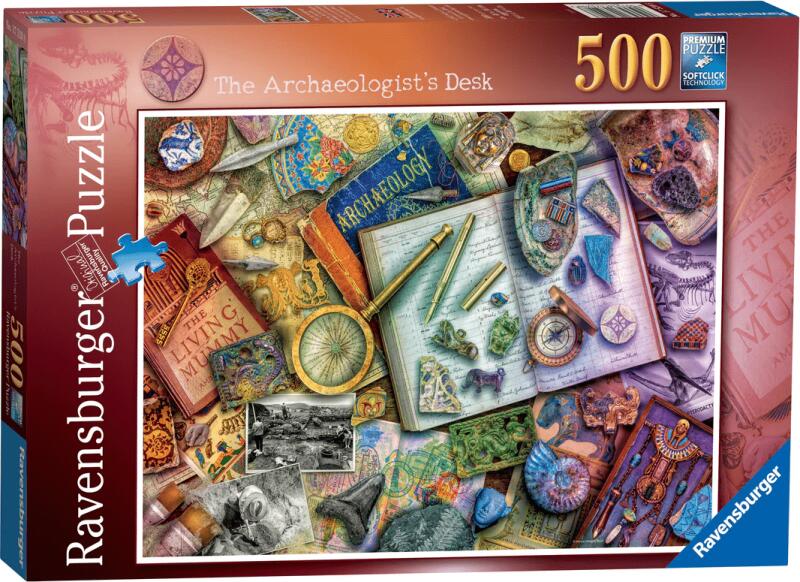 500 darabos kirakó . Márka: Ravensburger Művész: Aimee Stewart Kirakott kép méret: 49 x 36 cm Doboz méret: 33,5 x 23 x 3,5 cm Eredeti cím: The Archeologist's Desk GTIN: 4005556175208
