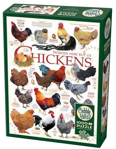 A kanadai Cobble Hill a nosztalgikus, színes, és mindemellett kiváló minőségű kirakókkal kívánja örvendetessé tenni a játék élményt kicsiknek és nagyoknak egyaránt. A Cobble Hill 1000 db-os puzzle - Chicken Quotes című képen különböző csirkefajták láthatóak.