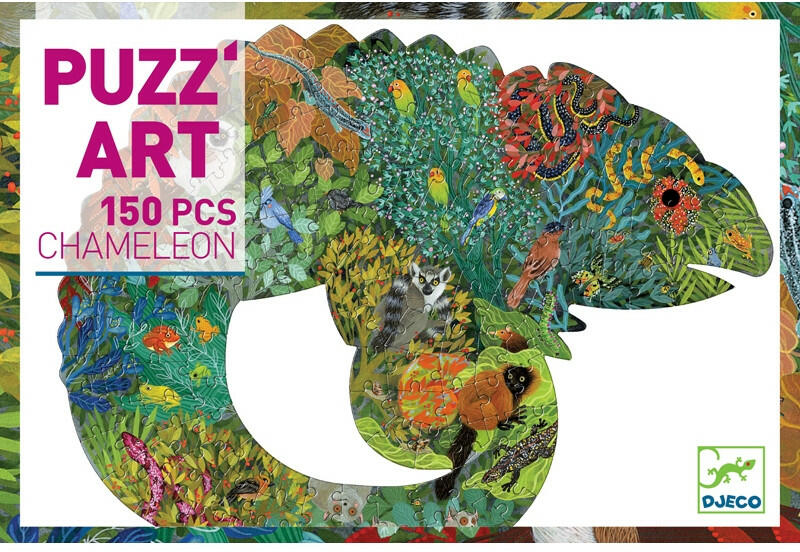 Részletgazdag kidolgozású kaméleon formájú és színvilágú 150 db-os puzzle. Kaméleon művészpuzzle 150 db puzzle részből A grafikus művész az állatok életképeiből alkot kaméleont formázó puzzle képet. A kaméleon formájú puzzle mintázata a természet gyönyörű részleteiből épül csodálatos színvilágú képpé. Hosszú időn keresztül böngészhető, rengeteg apr
