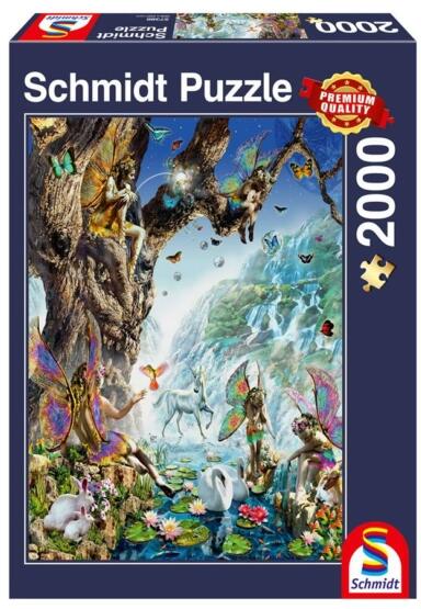 A Schmidt puzzle kiváló minőségű, német gyártmányú kirakó. A speciális matt lakk felhasználás következtében a kirakók fényvisszaverődés nélkül tárják elénk a szebbnél szebb képeket. Schmidt 2000 db-os puzzle - In the valley of the water fairies című képen egy fantasztikus tündérvilágba csöppenünk, tavirózsák között játszó vízi tündérek és színes pillang