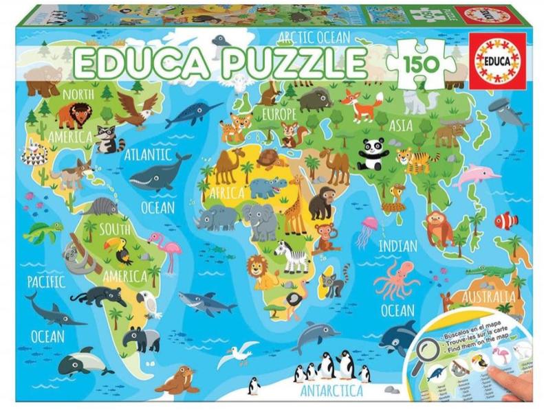 Világtérkép állatokkal motívumos puzzle gyerekeknek . A puzzle motívumában a világ legismertebb állatai jelennek meg. A kirakott puzzle ismét elemeire bontható és a dobozában tárolható. Építése során a gyermek fejleszti a fantáziáját, képzelőerejét és kézügyeszségét, valamint gyakorolja a részletekre való odafigyelést és ӧsszpontosítást. Az oktató puzzle gyere
