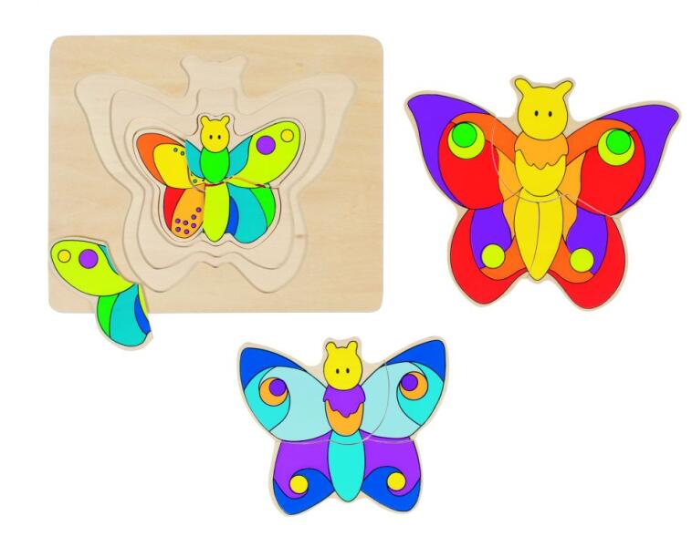 Többrétegű fa kirakó játék, 11 db-os. Ez a fa kirakó játék 4 kisebb-nagyobb pillangót tartalmaz. Az egyes rétegekhez tartozó fa kirakó elemeket el kell tudni különíteni, majd a legkisebb pillangó keretbe illesztésével kezdve mind a négy réteget ki kell rakni. Anyaga: fa Méret: 18 x 14,5 cm