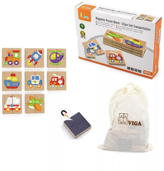A puzzle összesen 32 fadarabot tartalmaz, amelyekből különböző közlekedési eszközök rakhatók össze. Az egyes részek lekerekített élekkel rendelkeznek a kisgyermekek biztonságos játéka érdekében. A fa puzzle-készítés fejleszti a gyermekek logikus gon...