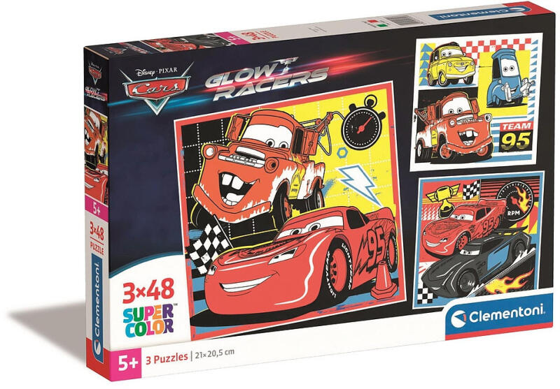 Disney Cars, Disney Verdák 3x48 db-os puzzle Clementoni Mérete: 21x20,5 cm Doboz mérete: 29 x 19,5 x 4 cm - SuperColor kollekció - kiváló minőség - 5 éves kortól ajánlott