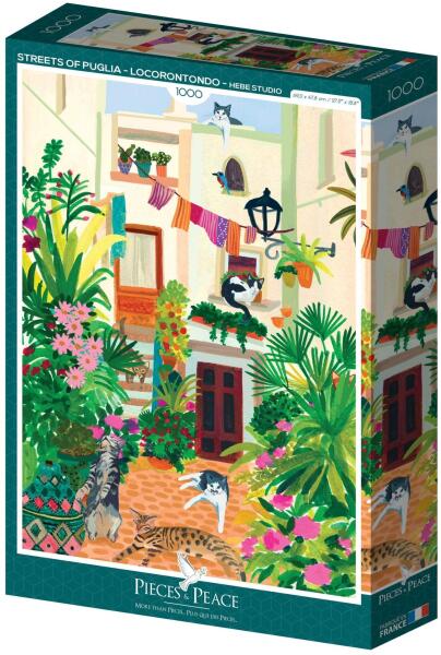 1000 darabos kirakó . Márka: Pieces & Peace Művész: Hebe Studio Kirakott kép méret: 47.8 x 69 cm Doboz méret: 35,5 x 24 x 5,5 cm Eredeti cím: Streets of Puglia - Locorontondo GTIN: 3770001401140